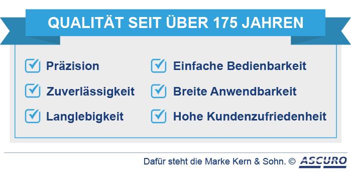 Seit über 175 Jahren steht die Marke KERN für Präzision und Zuverlässigkeit. Die Messgeräte sind darauf ausgelegt, Ihre Arbeit jahrelang zu begleiten und jeden Tag leichter zu machen. Sollten Sie jemals Fragen zur Bedienung haben, oder doch einmal ein Problem bei der Funktionsweise feststellen, zögern Sie nicht, sich direkt mit uns in Verbindung zu setzen!